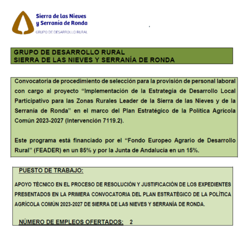 Convocatoria de procedimiento de selección para la provisión de personal laboral con cargo al proyecto “Implementación de la Estrategia de Desarrollo Local Participativo para las Zonas Rurales Leader de la Sierra de las Nieves y de la Serranía de Ronda” en el marco del Plan Estratégico de la Política Agrícola Común 2023-2027 (Intervención 7119.2).