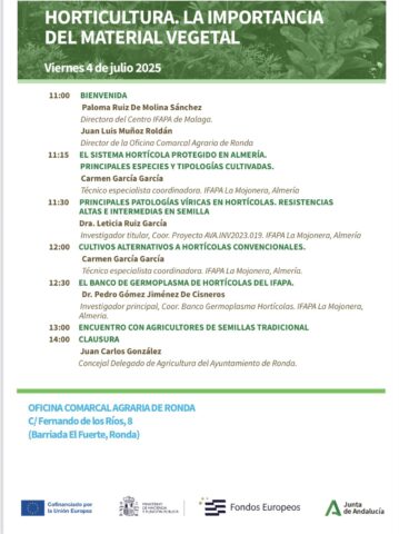 El pasado 4 de julio, asistimos a la jornada Horticultura y la Importancia del Material Vegetal, que impartió el Instituto Andaluz de Investigación y Formación Agraria, Pesquera, Alimentaria y de la Producción Ecológica de la Junta de Andalucía (IFAPA La Mojonera) en la sede de la OCA de Ronda.