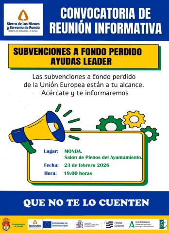 El  lunes 23 de febrero de 2026, tendrá lugar en el Salón de Plenos del Ayuntamiento de Monda, C/ Valdescoba, 1, a las 19:00 horas, una reunión informativa sobre las ayudas LEADER recogidas en la Estrategia de Desarrollo Local Leader Sierra de las Nieves y Serranía de Ronda  2023-2027.